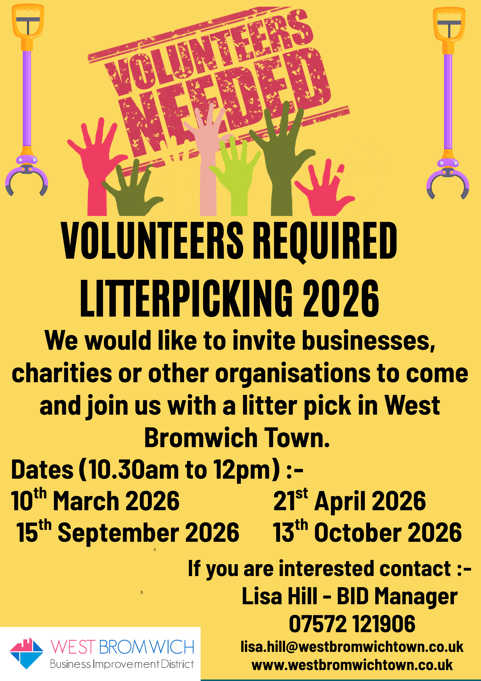 West Bromwich BID would like to invite businesses, charities or any other organisations to come and join the BID Team with Litter Picking round West Bromwich Town.